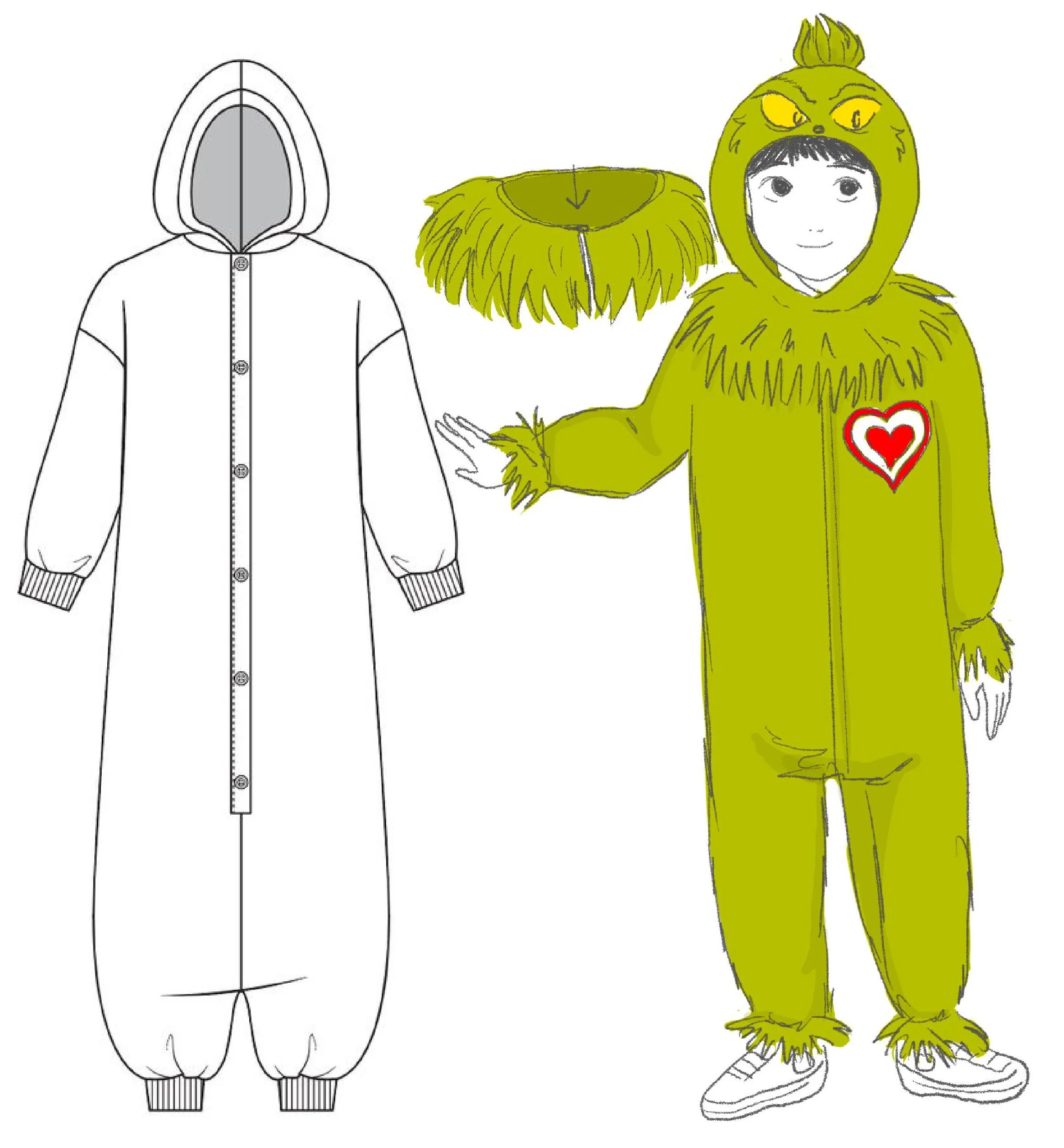 Concept sketch for a two part licensed costume kit including jumpsuit and detachable fur collar. This concept sketch was then used as the basis for technical drawings and a tech pack after licensor approval.
