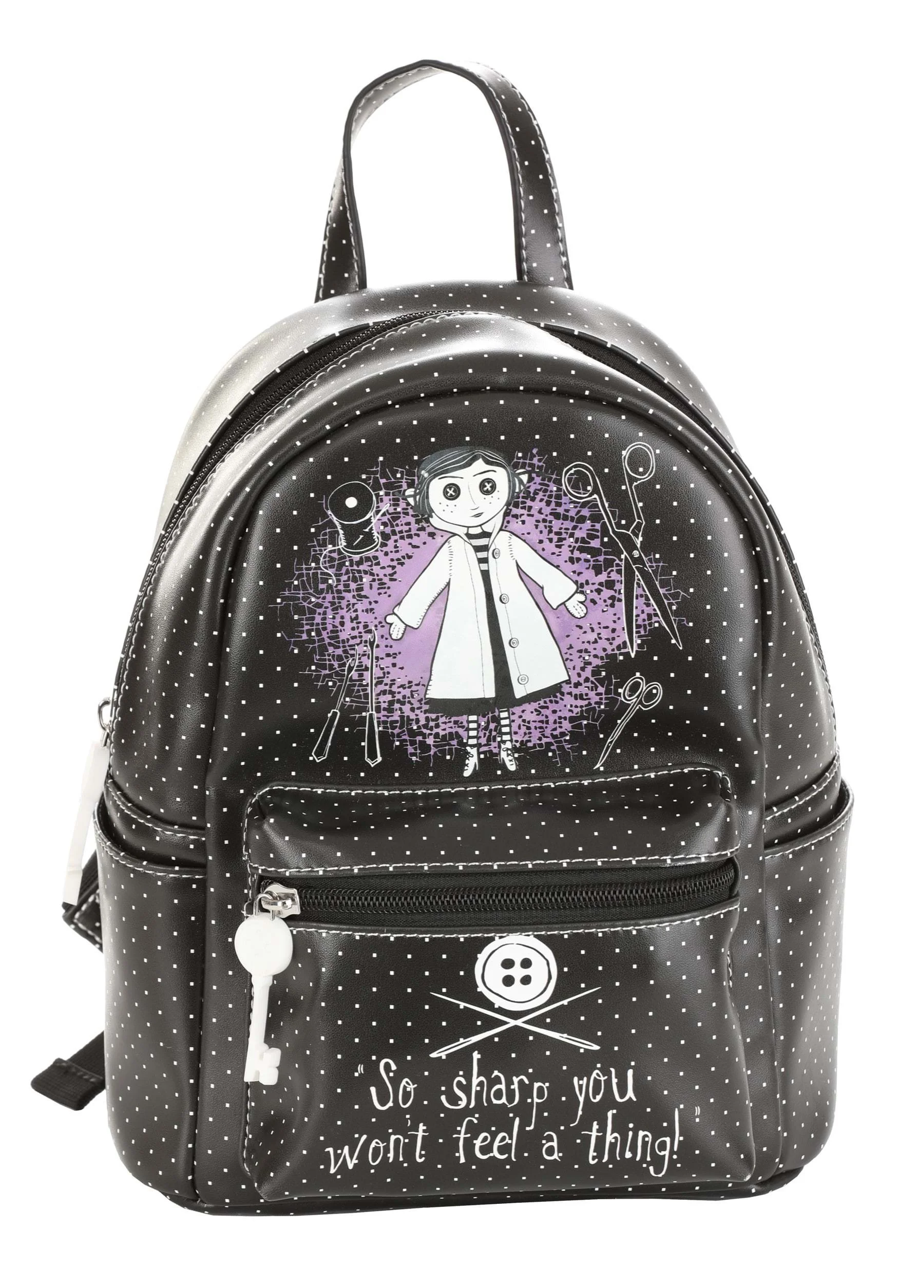 Officially licensed mini backpack. This is made of PU material and targeted towards a teen demographic. A special rubber zip pull is shaped to look like the bone key from the property's movie.